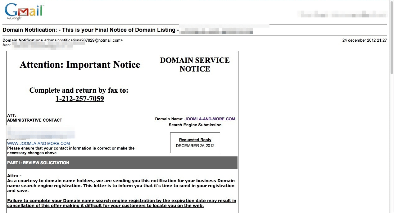 Of course, this is just a scam. You can register your domain name with Google, Bing, … for free. And to claim that, when you don’t do so, you will have a near zero chance to be found in the future? Flat out lie.