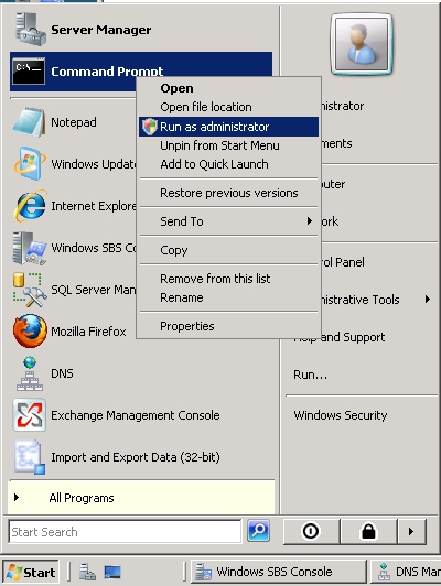1. Open the command prompt as Administrator. (For Windows 2008: Start > Right click “Command Prompt”
